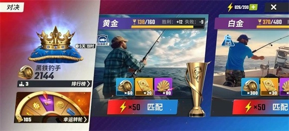 6、对决:对决在不同场获得的荣耀分数,消耗的体力不同,更高的场可以获得更高的荣耀分数,以及杯数提升,可以从中点击对决进行查看。对决是两个人进行比赛的模式。匹配到对方后,开始钓鱼。结算方式目前有三种,其中两种为,标准模式与最大。标准模式结算模式,就是看两个人在三分钟内掉起来的鱼的数量积分总和,积分高的一方取得胜利。最大结算模式,将自己在三分钟内掉起来的分数最高的六条鱼分数相加得到总分,与对方的最高分数六条鱼总分进行比较,高的一方获胜。