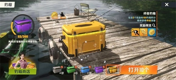 7、宝箱:宝箱是获得鱼竿的主要来源,只有金色宝箱才可以获得鱼竿,当账号等级没有解锁T2渔场的时候,无法通过打开宝箱获得T2鱼竿,所以需要提前存宝箱,等账号等级解锁了新渔场时候再打开宝箱。蓝色和紫色鱼竿属性没有金色鱼竿属性好,所以不建议升级蓝色或者紫色鱼竿,钓鱼体验不佳,浪费资源。金色宝箱主要留着开金色鱼竿,其他级别的宝箱产出金币与碳布,还有紫色和蓝色鱼竿。