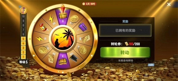 8、转盘:转盘是获取金色宝箱的来源之一,转轮票来源主要是锦标赛等奖励,每周会重置轮盘等级,每次抽取到金色宝箱或者紫色宝箱后提升轮盘左边的等级,最高10级,每一级的金色宝箱数量会提升。