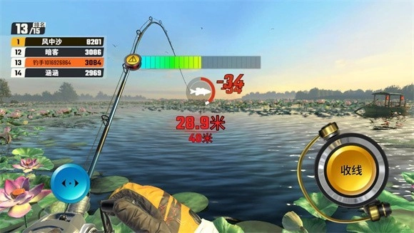 11、钓鱼技巧:左手当界面出现抛竿时,往对应方向滑动左下角操作按钮,进行抛竿。右手需要点击收线按钮,鱼上面的伤害条在接近红色时伤害最高,也就是最右边的时候,但是不能拉满,拉满会把鱼线拉断,所以操作右手的时候,在伤害条接近最右边的时候,就要及时松开,通过点击的方式保持伤害条在接近最右边点就可以。左手连续抛竿三次后,集齐能量条,在界面底部有显示,能量条满之后,右手上划,释放大招,持续造成高伤害,在释放大招时,先长按将伤害条拉到接近最右边再上划释放,这样可以造成最高伤害。