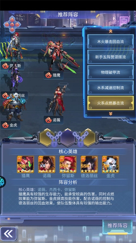 猎鹰的生存能力较为出色,能够承受较高的伤害,其点燃效果还可以提升弥留斯和金虎的技能伤害,再搭配诺薇的控制技能以及德洛丽丝的回血效果,能让整个队伍具备较强的输出能力。