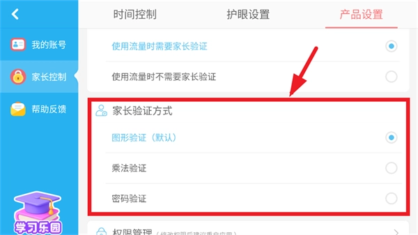 3.在产品设置里根据需求选择家长验证方式即可。