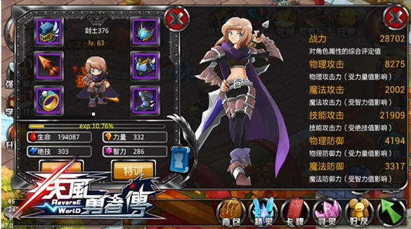 中主角和精灵分别可穿戴六件装备,主角装备中除了武器分职业,其他各职业通用。通过装备可以提升人物在中各方面的属性,增强战斗力。