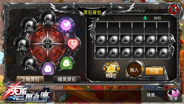 玩家通过寻灵获得各种灵石,灵石可以增加主角的能力,按品质从低到高分为绿、蓝、紫和橙色四种;
