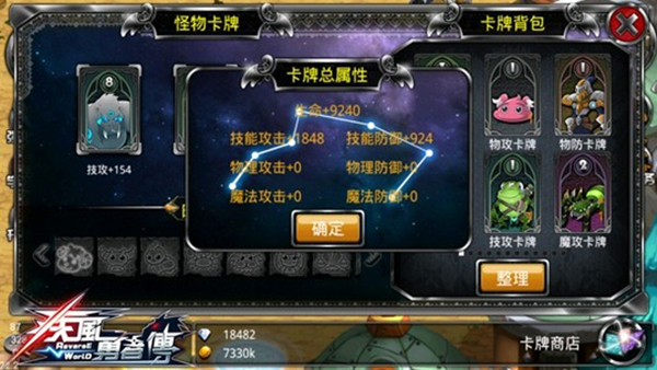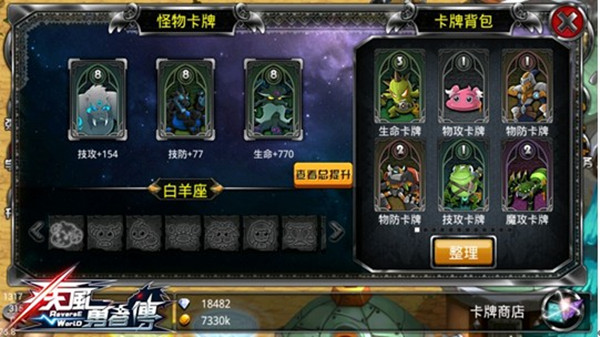 卡牌可以提供属性加成,分为物理攻击、魔法攻击、技能攻击、物理防御、魔法防御、技能防御、生命值;