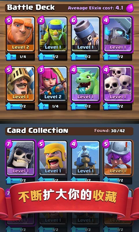 4. 收集皇室战争里的家庭成员,以及部落冲突中熟悉的军队、法术、防御建筑和其他卡片,用来构建并升级你的卡组。
