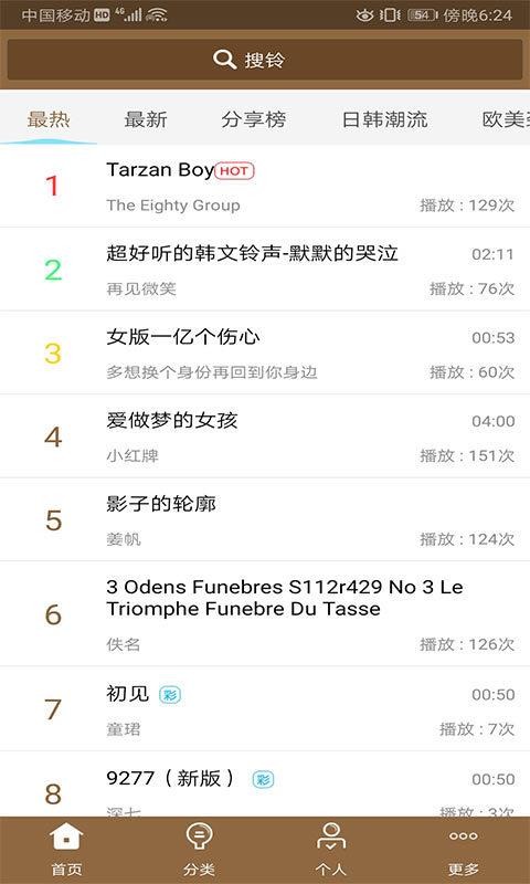 有网络流行、轻音乐、DJ、欧美日韩、时下热播剧、恶搞、摇滚等火热铃声,汇聚王源、热狗、五月天、汪苏泷、毛不易、杨超越、欧阳娜娜...等明星歌曲。