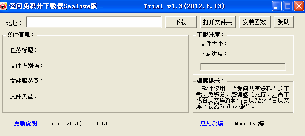 爱问下载器Sealove版,免积分下载爱问共享资料。【基本介绍】 最近,爱问共享资料更新后台,导致之前所有爱问共享资料下载软件失效,给很多朋友带来了麻烦,因此特地开发了新版软件,完全免费,可下载原版文档。【更新说明】 v1.3(2012.8.13): 1.爱问后台更新,导致复发下载,修复软件。 v1.2(2012.7.11): 1.修改Bug,优化下载。 v1.1(2012.7.10): 1.爱问下载器Sealove版v1.1完成。
