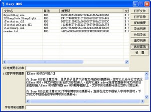 ☆ Easy MD5能与fsum.exe程序配合,以MD2、MD4、SHA1、SHA256、SHA384、SHA512、RMD、TIGER、PANAMA、ADLER、CRC32、EDONKEY算法计算文件的摘要码,点击选择算法按钮可打开选择算法对话框,打开文件时按住Shift键也可以打开选择算法对话框。