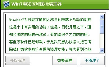 微软本身没有提供清理功能,每次看到这些多余的旧图标,怎么清理掉呢!区域图标清理工具将会为您轻松完成清理工作,简单方便,绿色实用点击[想要清理]释放[开始清理]并单击便会自动进行历史记录的清理,还通知区域图标初始化状态…