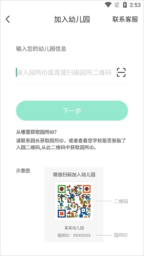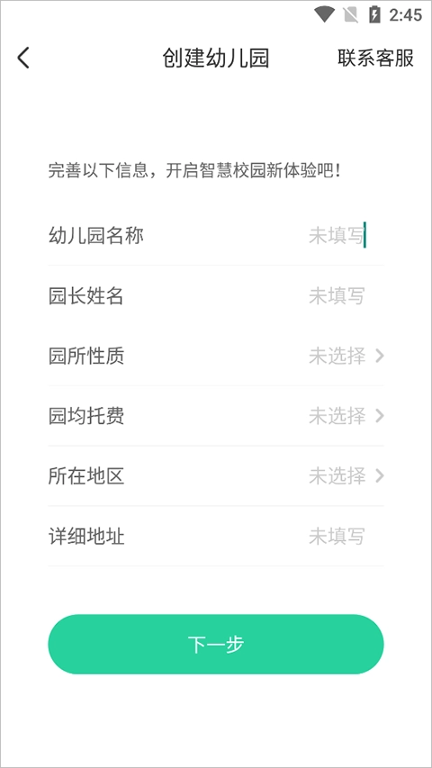 5、这个时候你只需要输入您的幼儿园信息,点击“下一步”.