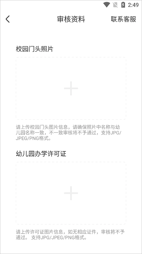 3、这个时候会出现一个审核资料,里面包括:校园门头照片、幼儿园办学许可证,然后点击提交即可。