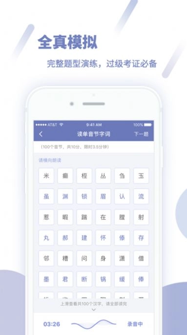 3、短文朗读:提供普通话测试大纲短文朗读篇目和朗读范本,可反复听取朗读范本并进行朗读评测。1、普通话测试全真模拟,涵盖普通话考试全部题型,轻松说好标准普通话;