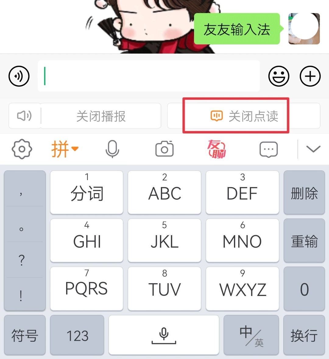 三、语音点读:在输入法键盘界面中启动点读功能,之后跳转至手机设置以开启友友输入法的悬浮窗权限。