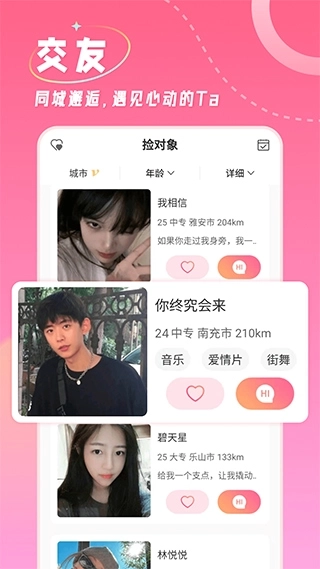 4、超高曝光:置顶功能,超高曝光度,快速提升异性缘,在捡对象邂逅有缘人;