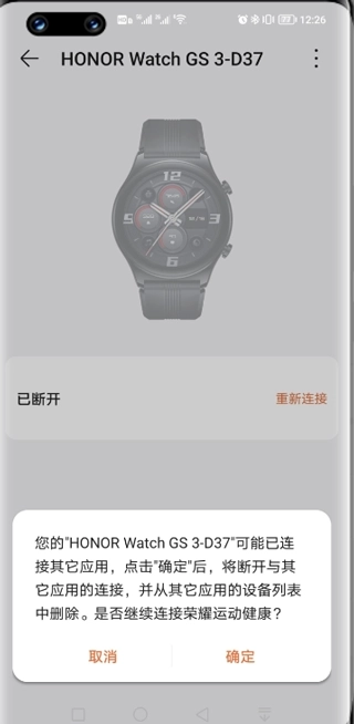 3、连接过程页面将提示是否继续连接荣耀运动健康,选择确定。