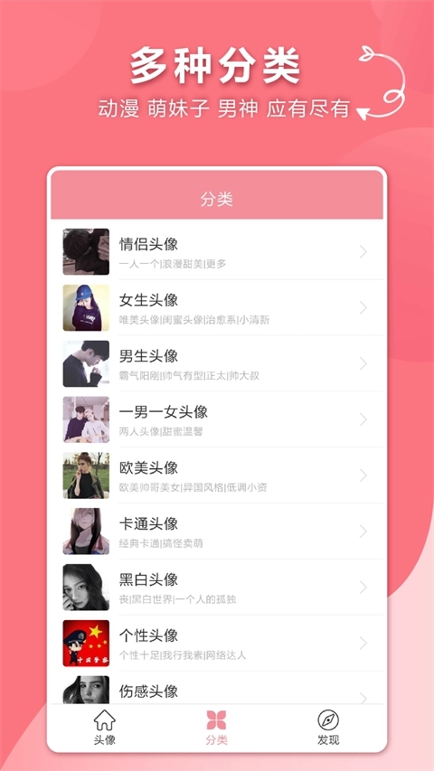 6、头像分类:流量到海量头像内容,充分浏览到图片。