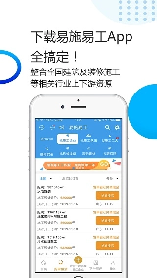 6、就近接单:只要打开抢单接活功能,即可看到附近发布的施工信息,可实时显示接单距离。2、建筑施工接单:入驻企业或者个人承接建筑/装修/施工、租赁、供应等工程信息。
