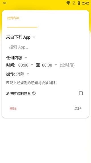 添加任意自定义规则以过滤,支持按App黑白名单,文本关键字匹配,正则等。过滤可选对通知消除或静音。