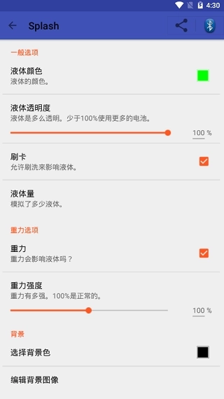 5、发现可以设置液体颜色、透明度、液体的量等液体选项,还有重力选项,最后是背景选项