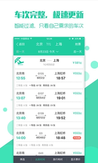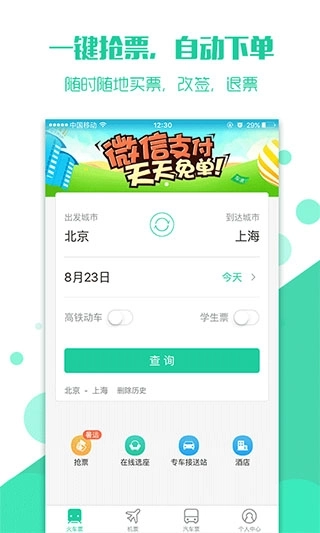 这是一款专业实用的手机抢票应用,旨在帮助用户购买所需的火车票。该应用提供火车票、机票、汽车票、高铁票等多种票务服务,并支持用户在线购买。如果没有票,也不用担心,可以一键启动抢票功能,并允许用户选择多趟车次同时进行抢票,以提高成功率。此外,这款抢火车票的应用不仅支持线下购票、在线选座和抢票服务,还提供专车接送、酒店预订和门票购买等服务,非常全面,能够轻松满足用户的多种需求。