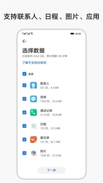 3. 给予荣耀手机更为完善的支持,无需进行root操作,就能实现更多数据(像应用数据、日程安排、备忘录、闹钟、浏览器书签等)的传输。