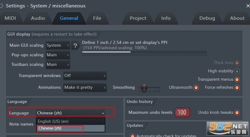 打开FL Studio的“常规设置”窗口,在“language”模块里,能看到有一行是language的选项框。点击该下拉选项框,然后从中选择“Chinese(zh)”就可以了。