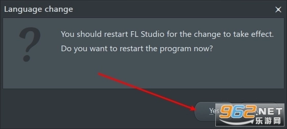 完成语言设置后,会弹出“语言切换”窗口,窗口显示内容为:需重新启动FL Studio编曲软件才能生效,是否现在重启?点击“yes”,即可完成设置并重启FL Studio编曲软件。