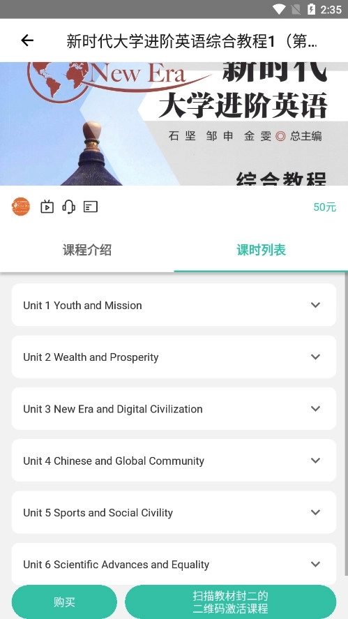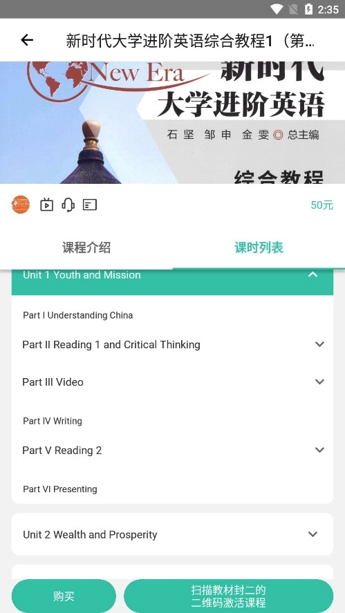 同样,在 APP 首页左上角找到扫描功能,通过它扫取“新时代系列教材”中「学生用书」封二上的二维码,就能激活相应资源。并且,每个资源码仅能使用一次,使用过后便失效。