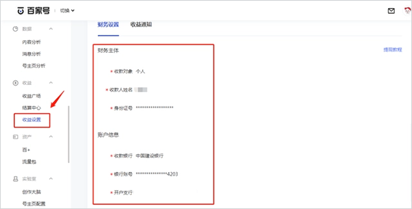 2、在首页左侧导航栏中,找到“收益——收益设置”,点击“收益设置”进入收益设置页面,在此页面完善并修改财务信息。请注意,开户行需具体到支行。