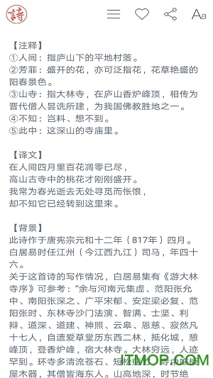 诗词大观app是专门为古诗爱好者打造的,拥有海量古诗词资源,唐诗、宋词、全隋诗等各类皆有涵盖,快来下载学习吧!