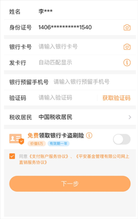 第四步:录入并确认被保险人支付信息,然后点击“下一步"按钮