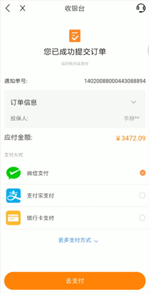 提交订单,系统自动审核通过后,您可以选择支付方式,进行保费支付。