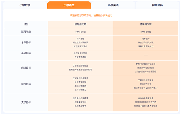 猿辅导依据不同孩子的特点,将其分为两个班级:读写强化班与博学腾飞班。这两个班级面向小学一年级至六年级的小朋友。读写强化班旨在夯实基础,助力小朋友搭建读写知识体系、梳理语文知识点;博学腾飞班则侧重于培养能力,帮助小朋友提升语文综合学习能力,同时培养文化审美能力。两个班级的目标存在一定差异。