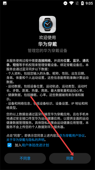 1、打开【华为穿戴】的服务协议页面,查看其需要获取的个人、运动、健康、设备等相关信息,在确认条款内容后点击【同意】按钮,以便继续使用该服务。