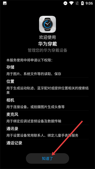 2、在【华为穿戴】的权限申请界面,查看其请求的存储、位置、相机等权限,点击【知道了】按钮以确认这些权限申请。