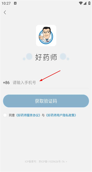 3、进入注册登录页面,显示好药师标识,需填写手机号码,点击获取验证码,勾选协议完成流程。