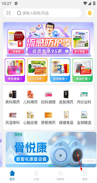 打开软件后,界面上设有搜索栏与流感防护季活动板块,还分类呈现了用药类目,点击“我的”即可进入对应的功能页面。
