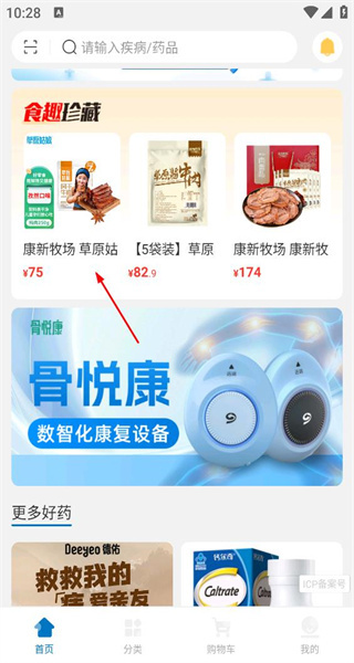 4、返回好药师首页,展示食趣珍藏板块及对应商品并标注价格,下方呈现骨悦康设备的推广内容。