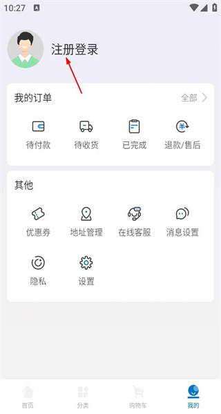 2、进入“我的”页面,顶部设置注册登录按钮,下方设有我的订单板块,该板块包含待付款等项目,随后点击注册登录按钮。