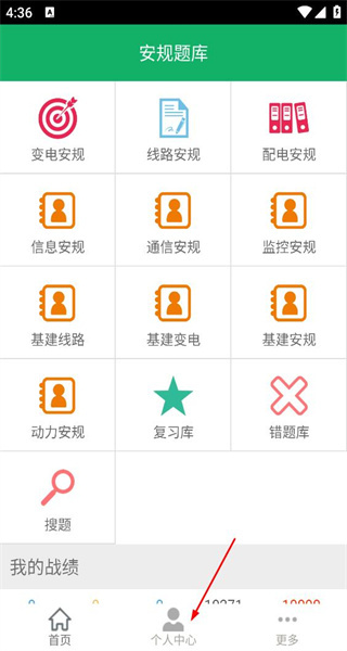 打开安规题库软件进入首页后,能看到变电安规等多个分类板块,此时点击个人中心即可。