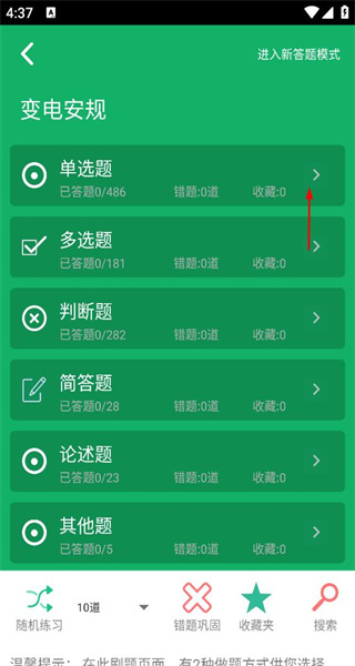 4、完成注册后进入变电安规板块,能看到单选题、多选题等不同题型的分类,大家可以根据需求选择相应题型开始练习。