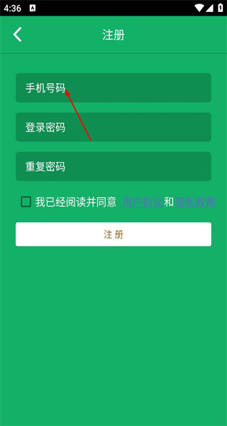 3、进入注册页面后,先填写手机号码,接着设置密码并再次输入以确认,之后勾选相关协议,即可完成注册流程。