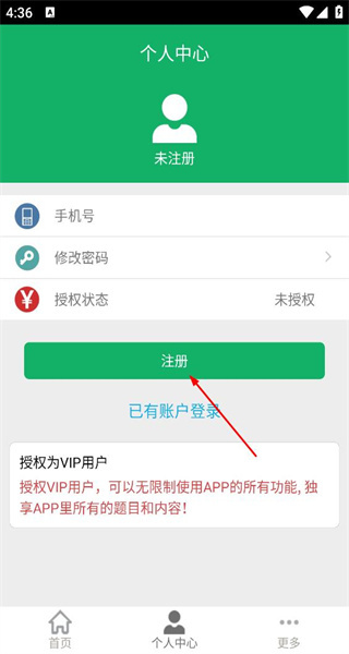 2、进入个人中心后,点击注册按钮跳转至注册页面,该页面要求填写手机号并设置密码。