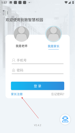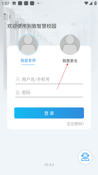 1、在登录界面,点击【我是家长】,切换至家长身份的登录相关页面。