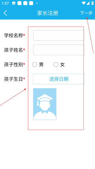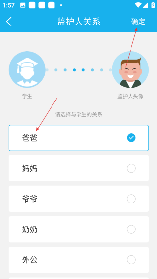 3、选择与学生的关系后,点击【确定】,进入家长注册的信息填写页。