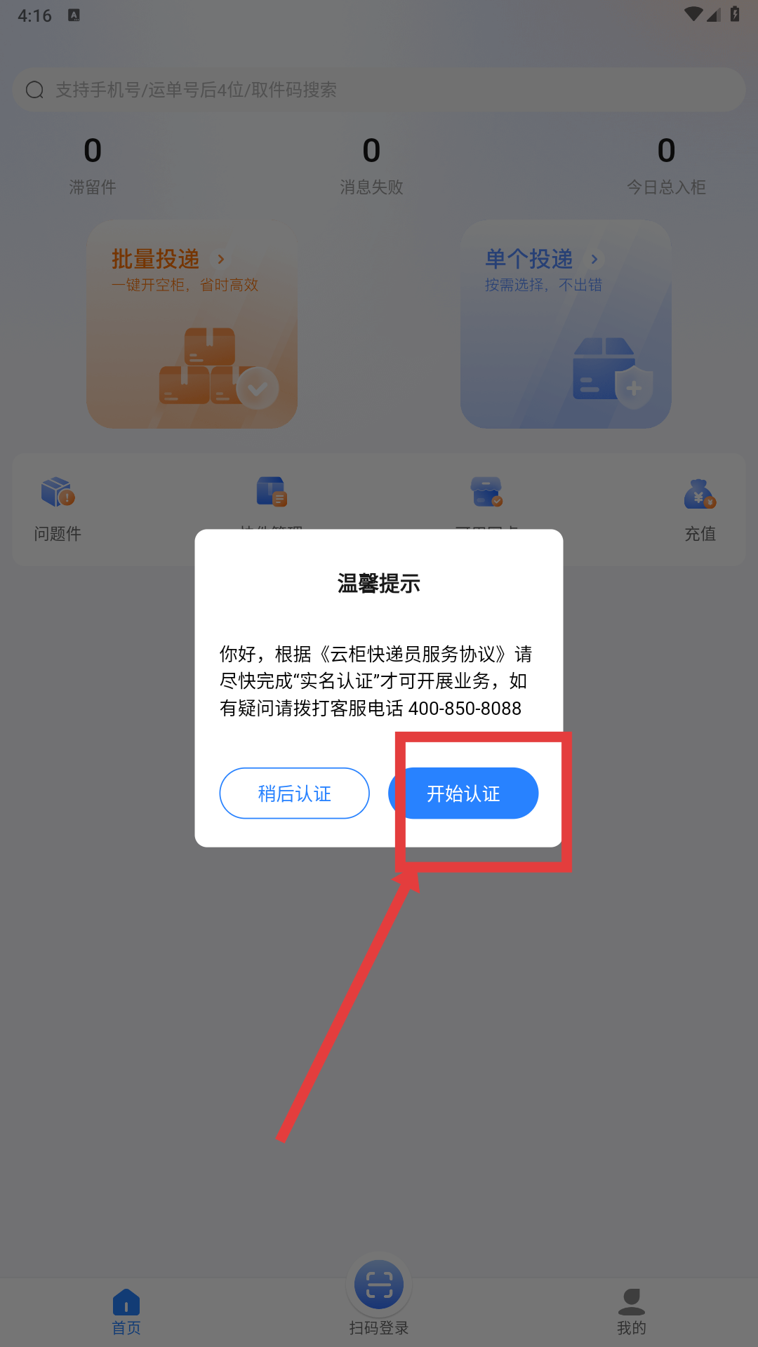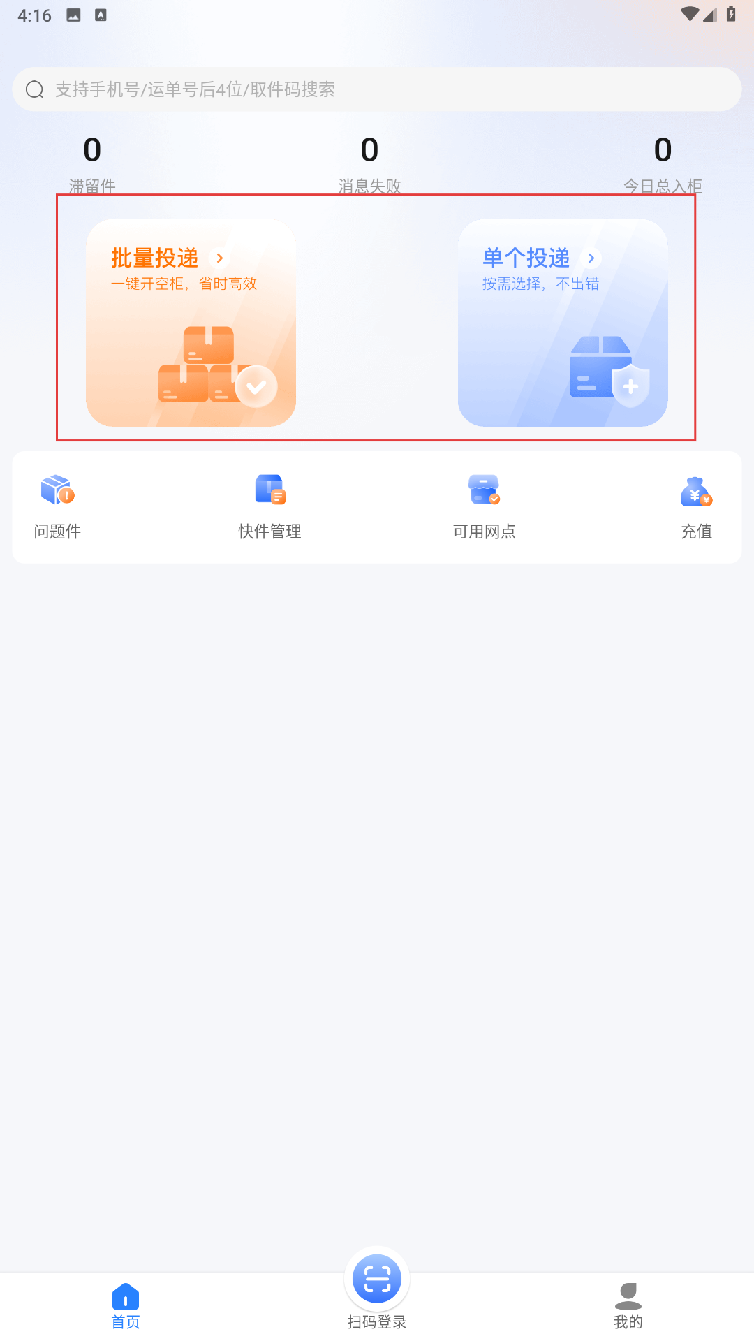 3、认证完成后,在首页选择【批量投递-功能】,可一键开空柜处理快件。