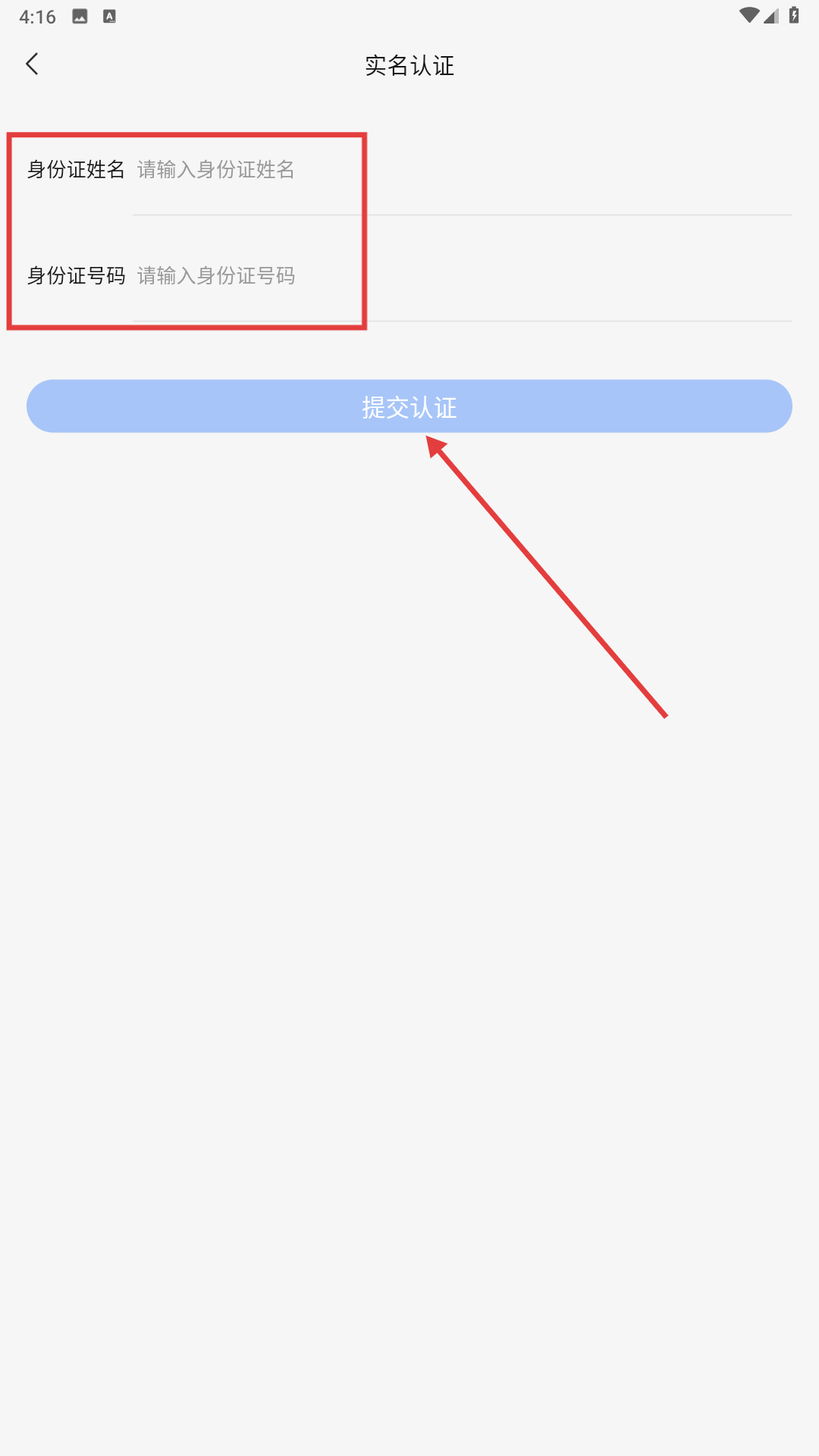 2、进入实名认证页面后,在【身份证姓名输入框】和【身份证号码输入框】中分别填写对应信息,随后点击提交认证按钮完成操作。