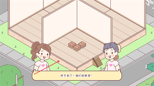2、完成形象设置后进入新家场景,可看到空房间与纸箱道具,后续可通过互动解锁家具等装饰内容。
