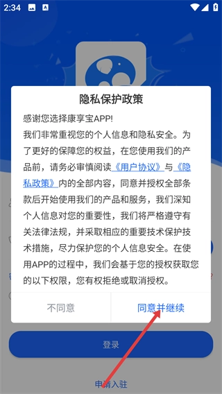 1、在康享宝隐私保护政策的弹窗里,点击【同意并继续】按钮,即可进入登录页面。